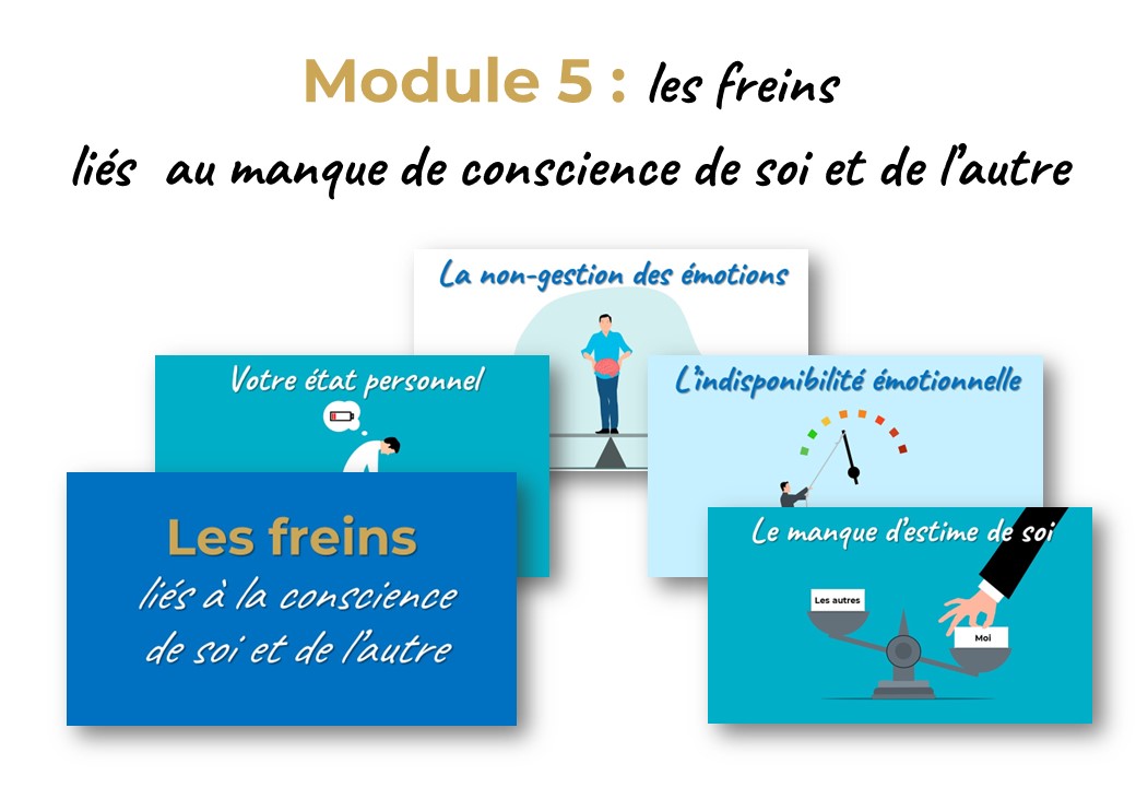 Dans ce module, découvrez les défis liés au manque de conscience de soi et de l'autre, de l’importance de votre propre état personnel, de votre disponibilité émotionnelle, de votre gestion des émotions et de l'estime de soi. Apprenez à mieux vous connaître, à mieux comprendre les autres, et à développer des relations plus enrichissantes.